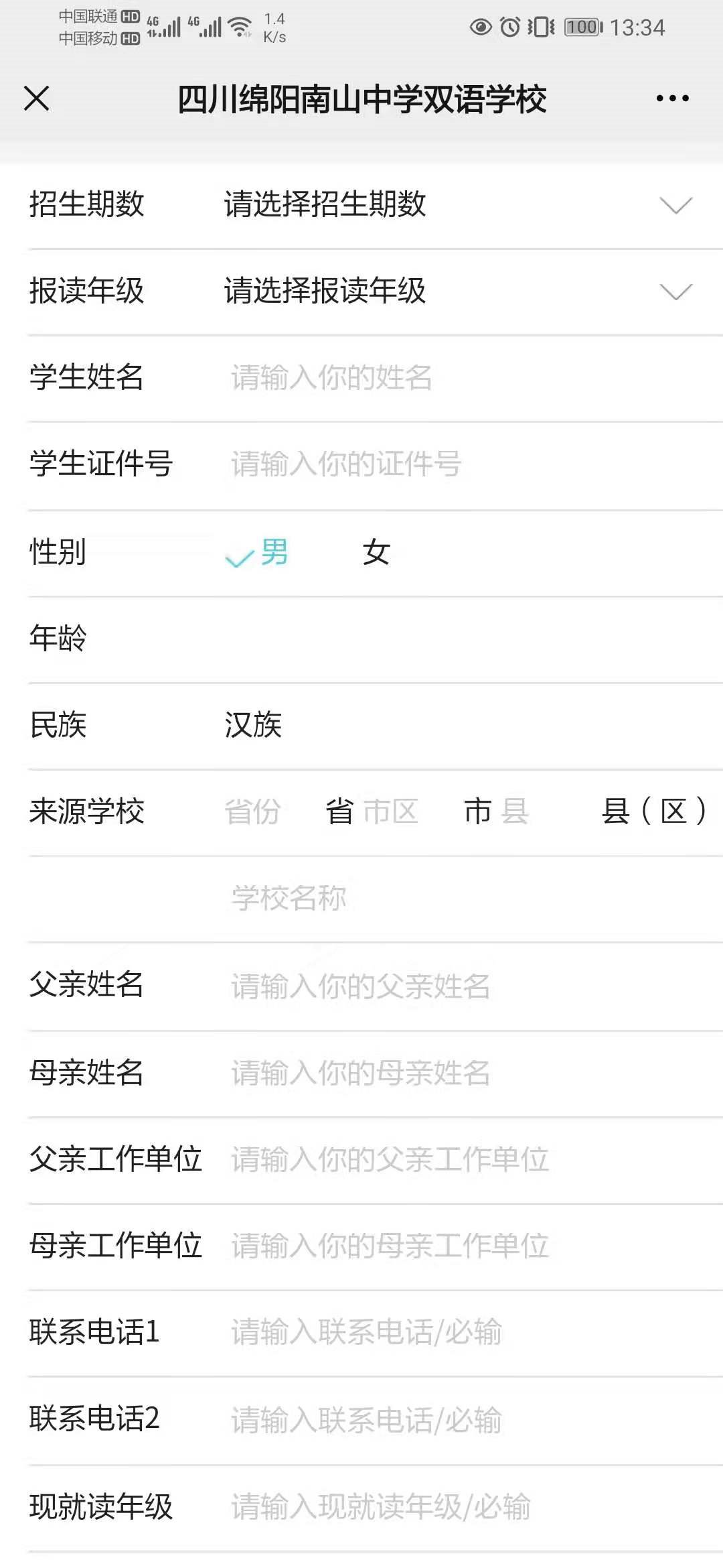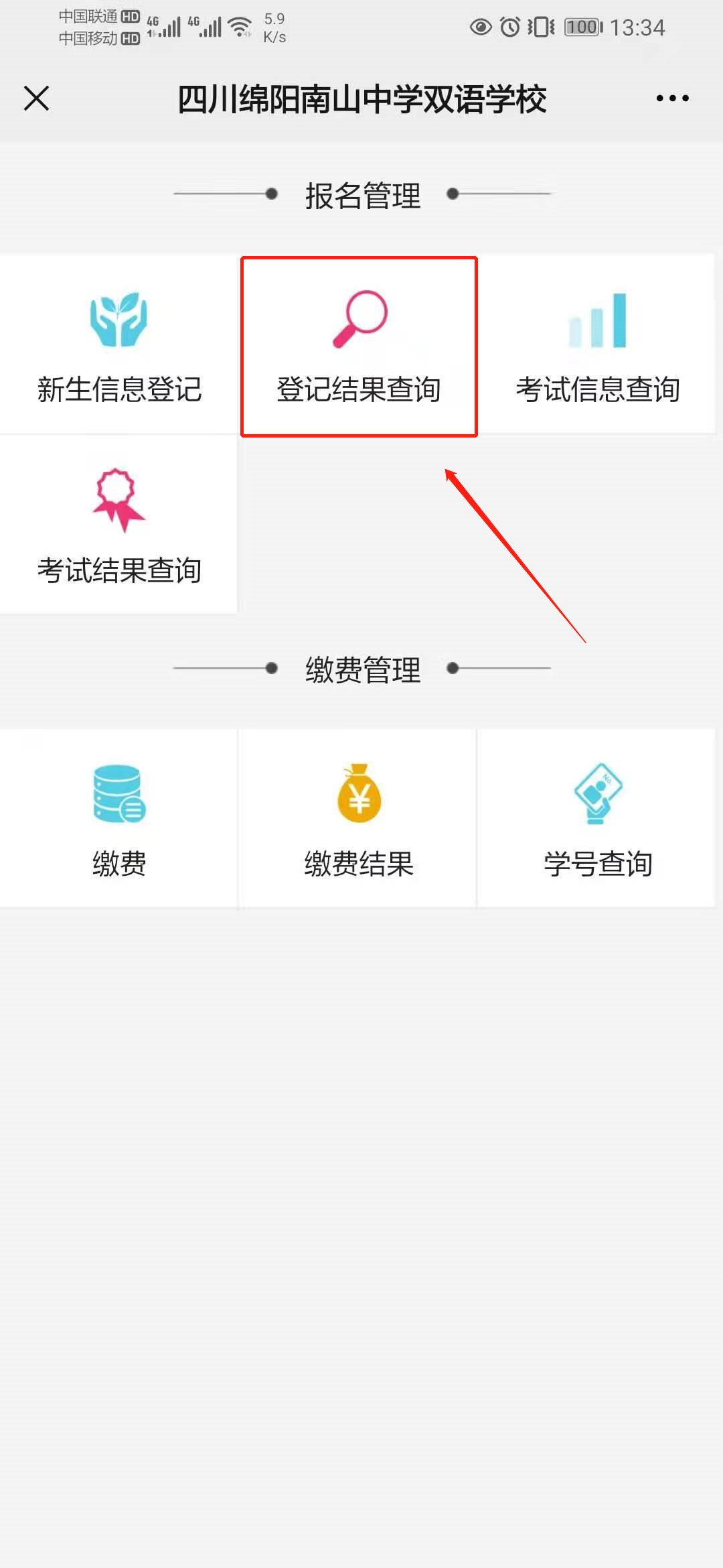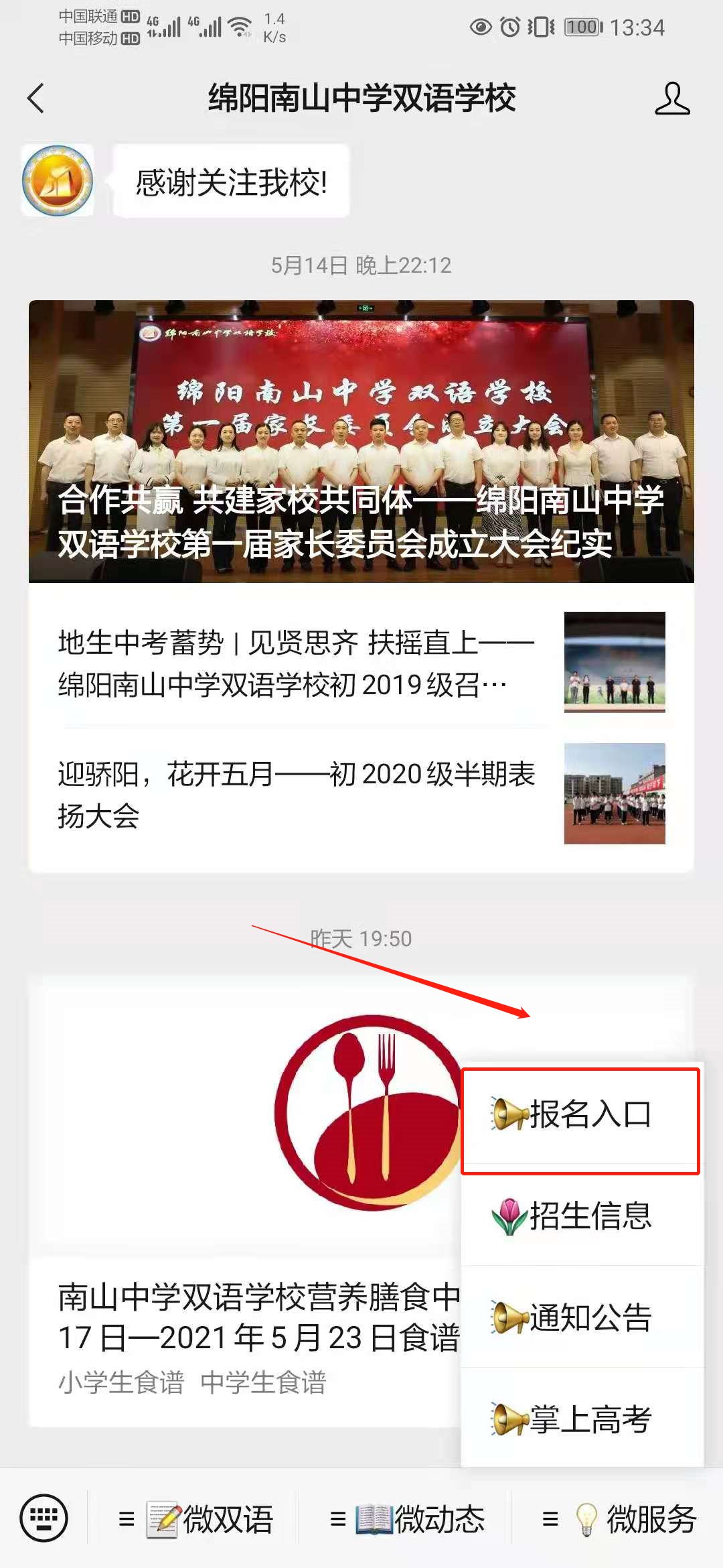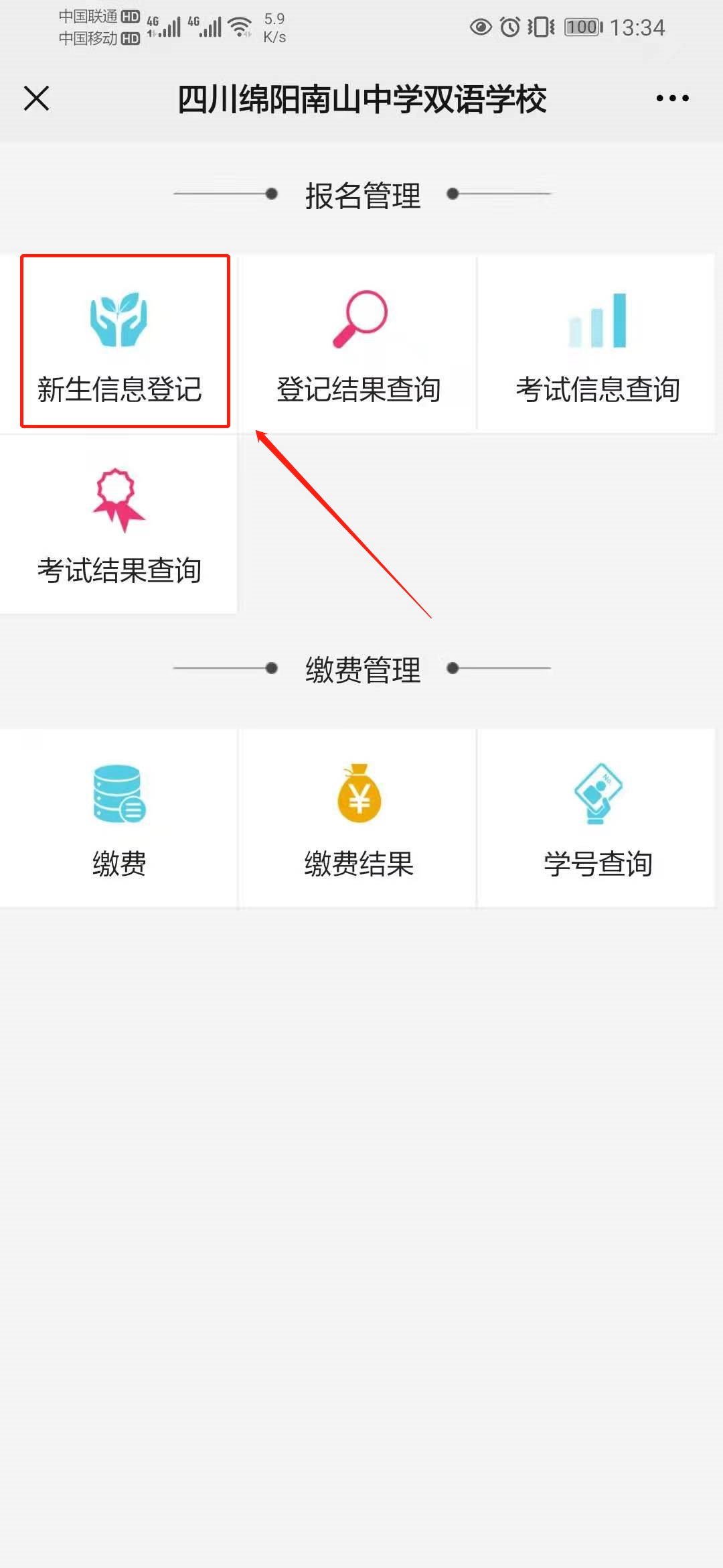 打开微信搜索界面,搜索【绵阳南山中学双语学校】并关注,点击右下角微服务——报名入口——新生信息登记。登记结束后返回新生信息登记页面,进入登记结果查询,生成报名学号即报名成功。