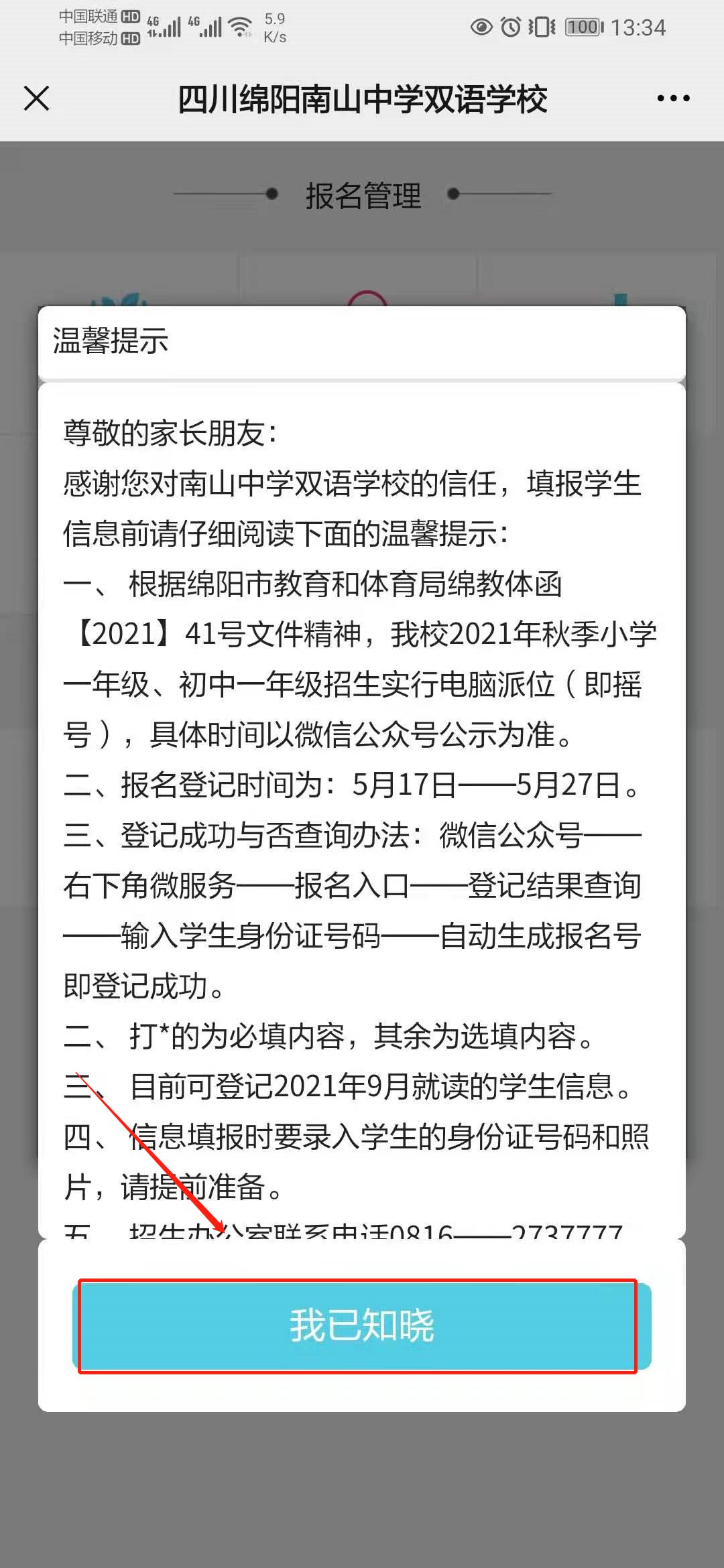 第四步:阅读并点击“我已知晓”,报名需要提前准备好身份证号和照片