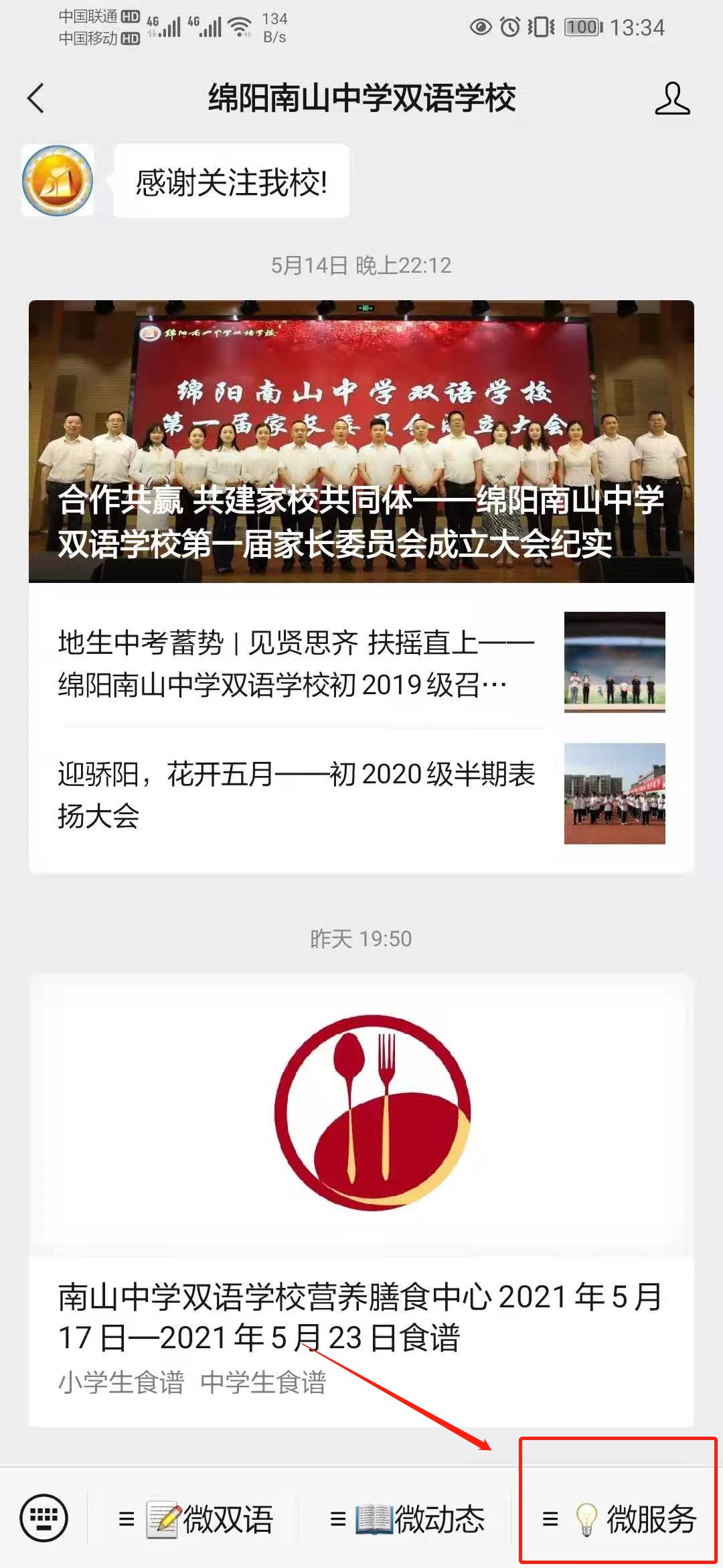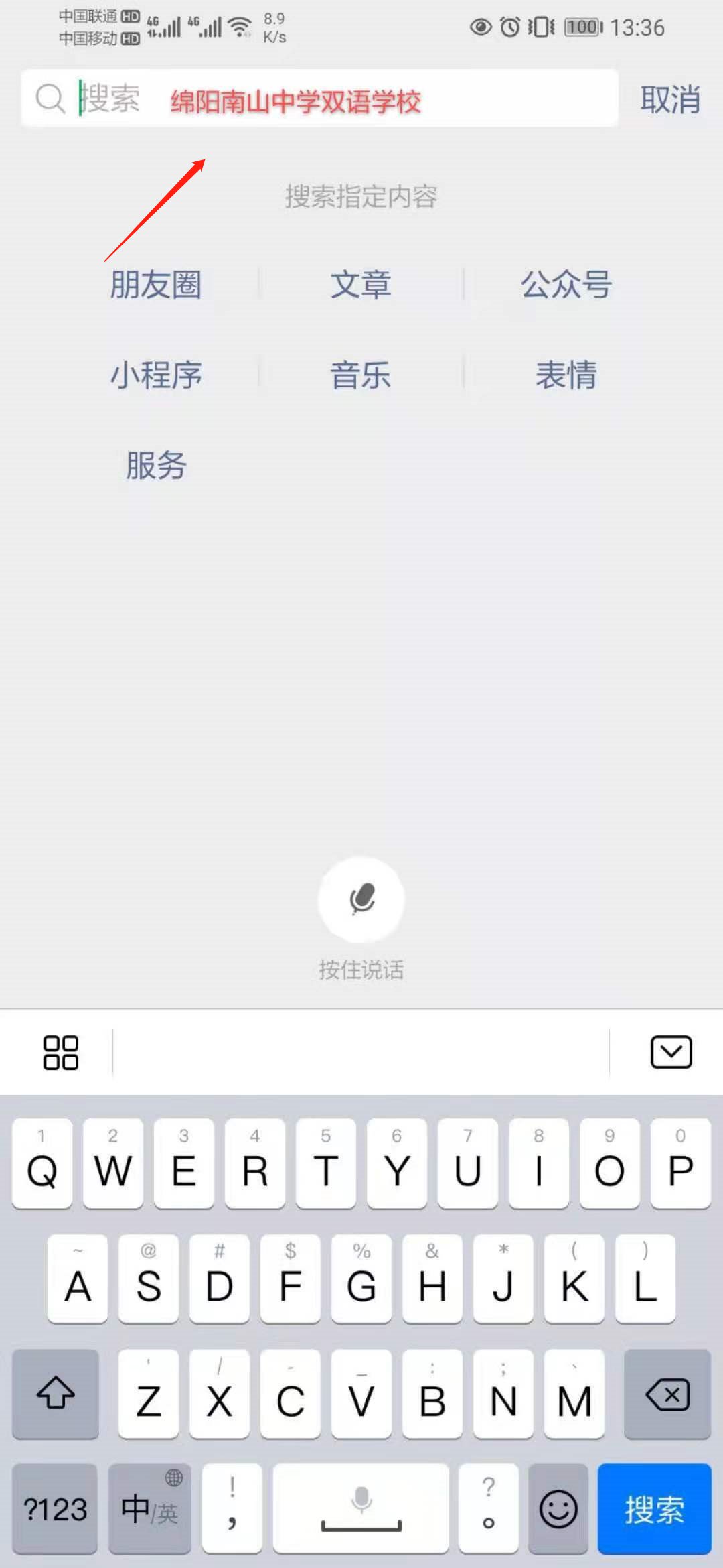 第一步:打开微信搜索界面,搜索【绵阳南山中学双语学校】并关注