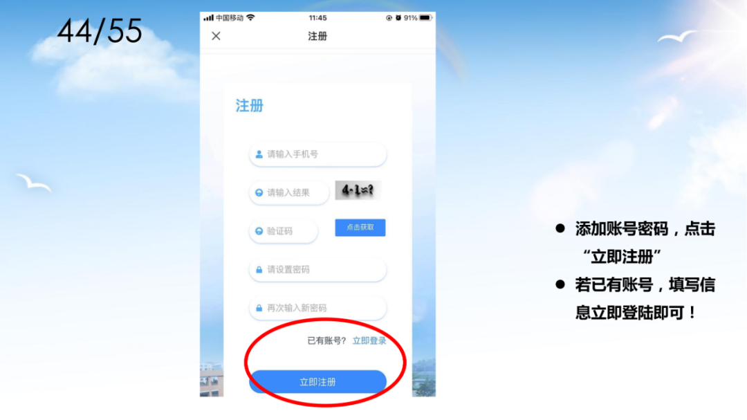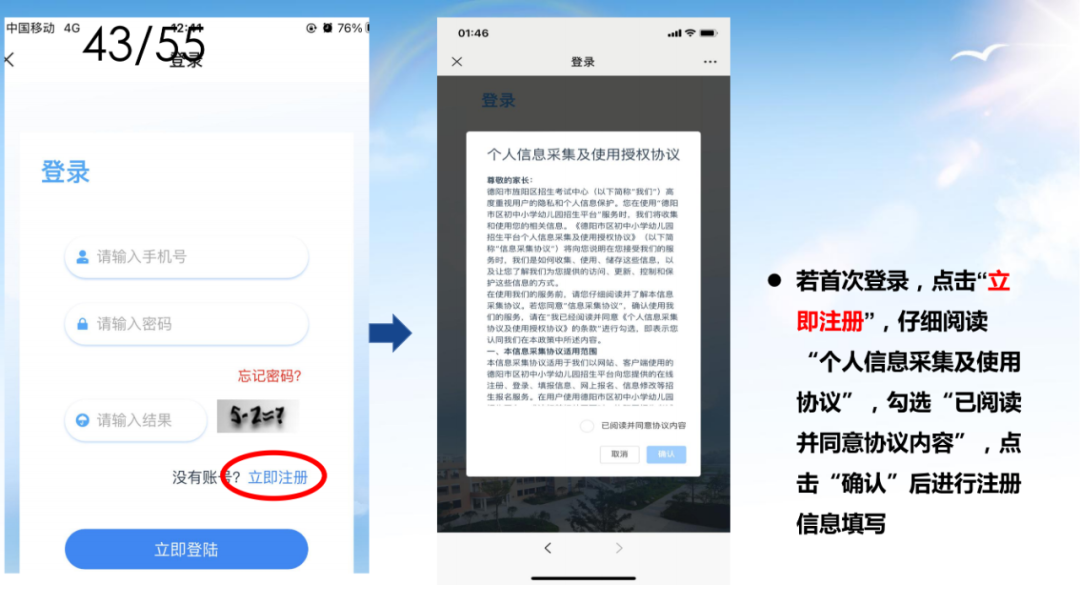 2、点击“登录/注册”(若首次登录,点击“立即注册”,仔细阅读“个人信息采集及使用协议”,勾选“已阅读并同意协议内容”,点击“确认”后进行注册信息填写);