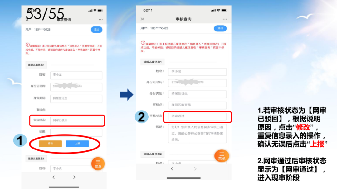 若审核状态为【网审已驳回】,根据说明原因,点击"修改”,重复信息录入的操作,确认无误后点击“上报”。网审通过后审核状态显示为【网审通过】,进入现审阶段