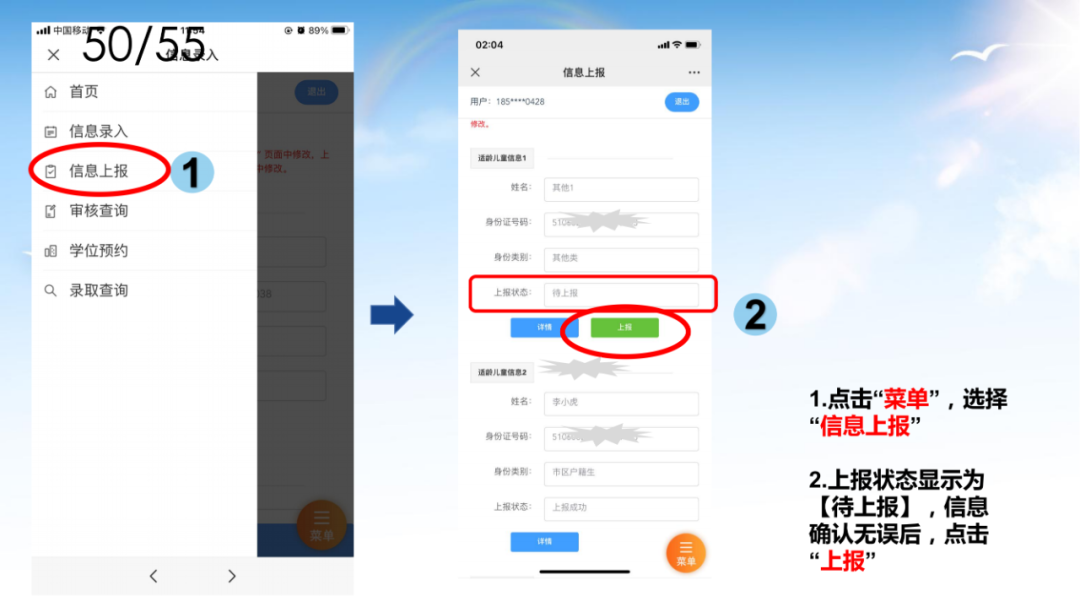 8、点击“菜单”,选择“信息上报”。2.上报状态显示为【待上报】,信息确认无误后,点击“上报”