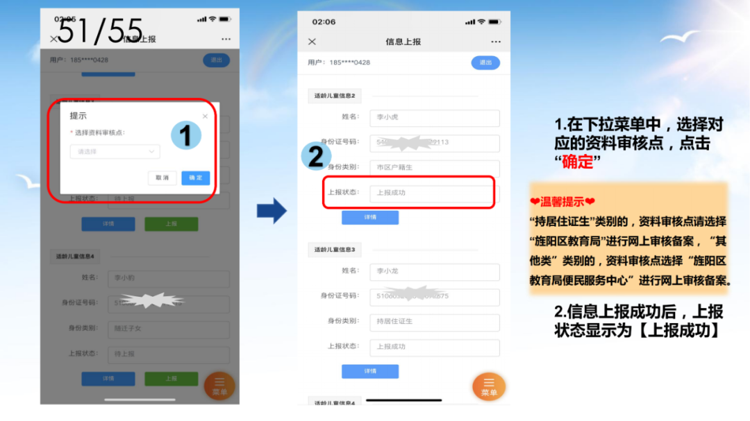 “持居住证生"类别的,资料审核点请选择“旌阳区教育局""进行网上审核备案,“其他类”类别的,资料审核点选择“旌阳区教育局便民服务中心”进行网上审核备案。信息上报成功后,上报状态显示为【上报成功】