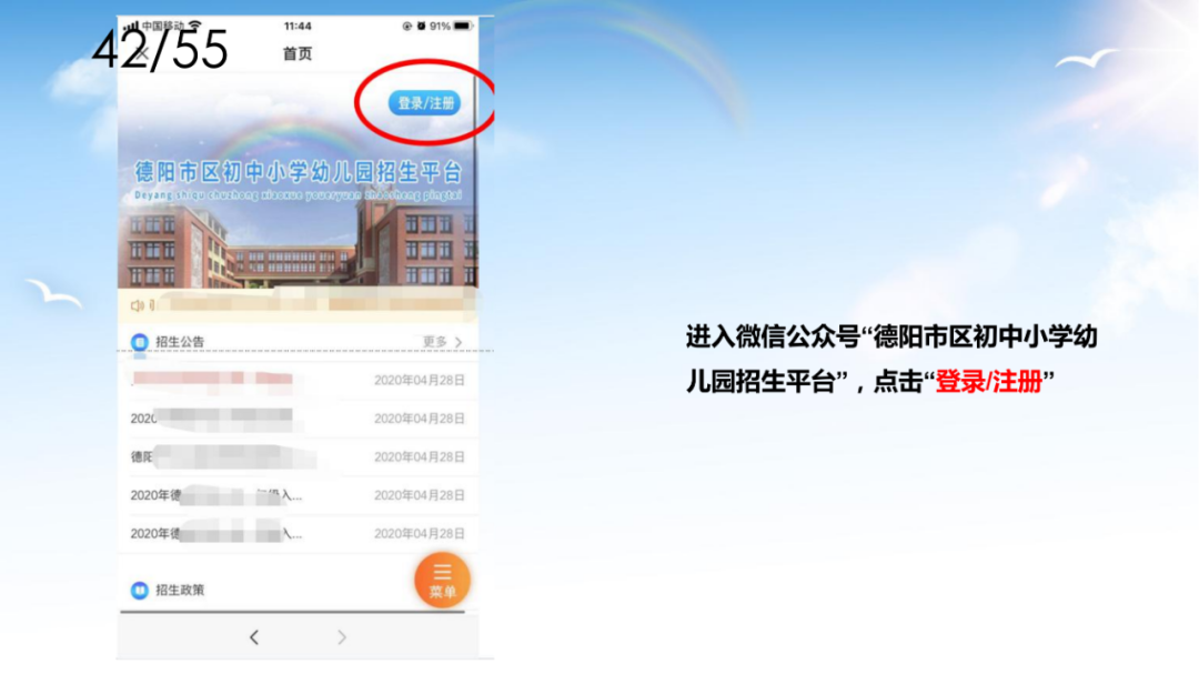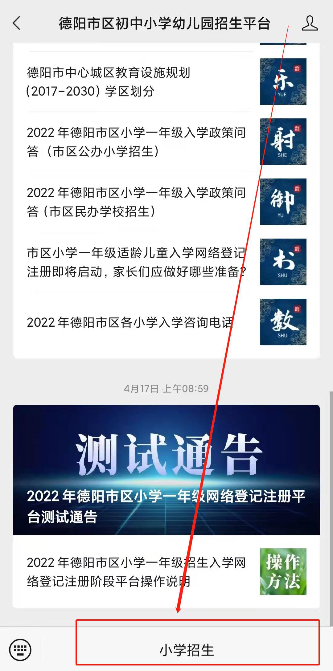 1、关注微信公众号“德阳市区初中小学幼儿园招生平台”,点击页面下方“小学招生”;