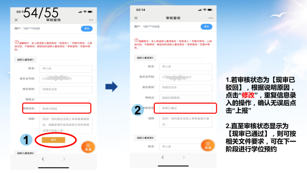 若审核状态为【现审已驳回】,根据说明原因,点击“修改”,重复信息录入的操作,确认无误后点击“上报”。直至审核状态显示为【现审已通过】,则可按相关文件要求,可在下一阶段进行学位预约