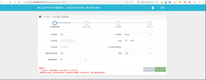 监护人信息填写页面,将必填的信息填写完成之后点击“下一步”进入下个模块。