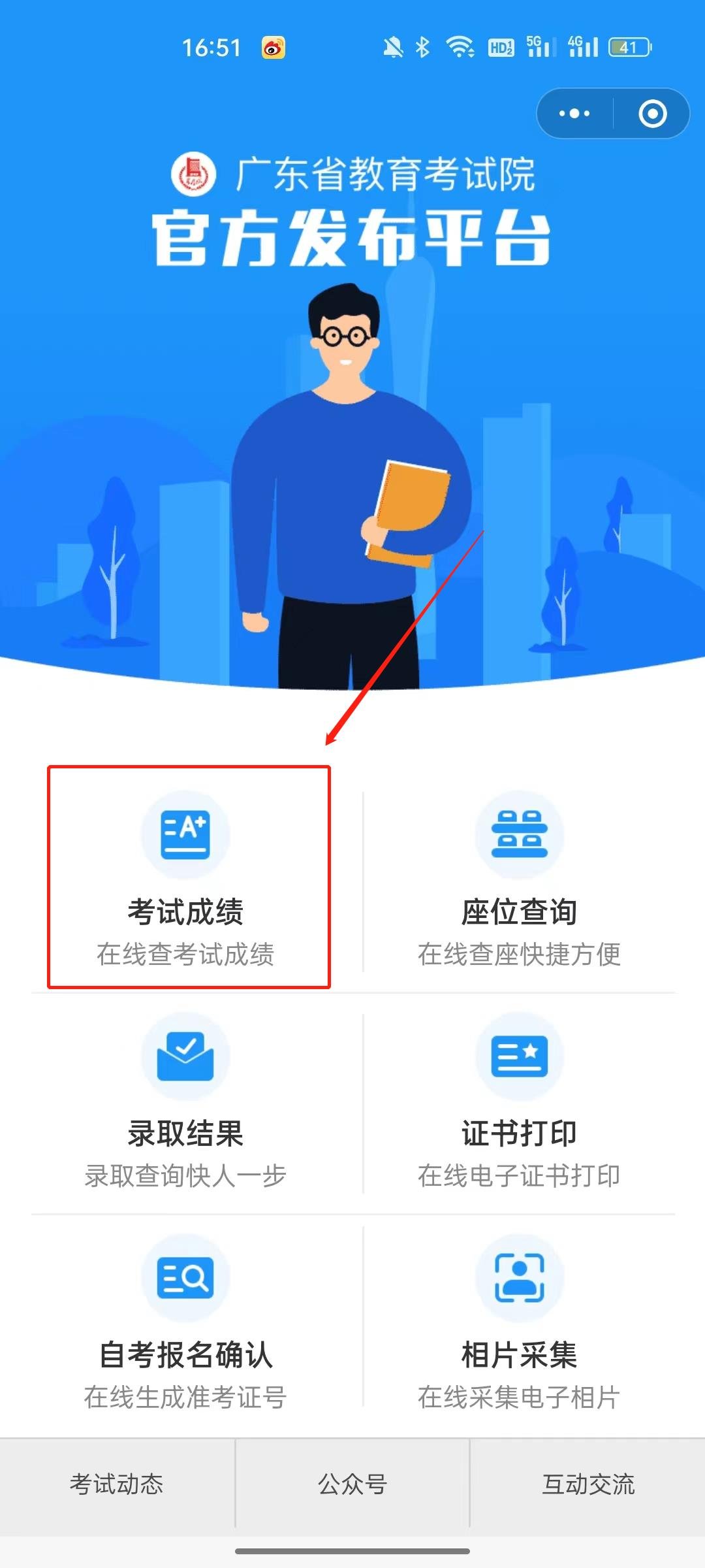 第一步:登录“广东省教育考试院”微信小程序,点击“考试成绩”。Q5R育儿早教网