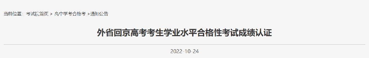 已在外省参加高中学业水平考试(高中会考),拟回京参加北京市2023年高考的外省学籍考生,须于2022年10月26日10:00至11月4日12:00进行“外省回京高考考生高中学业水平合格性考试成绩认证”。