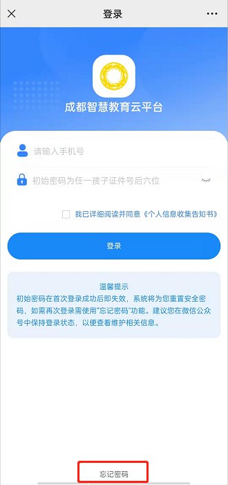 成都智慧教育云平台家长初始登陆密码:任何一位子女的身份证号(港澳台居民子女、外籍人士子女为相关法定证件号)后6位。
