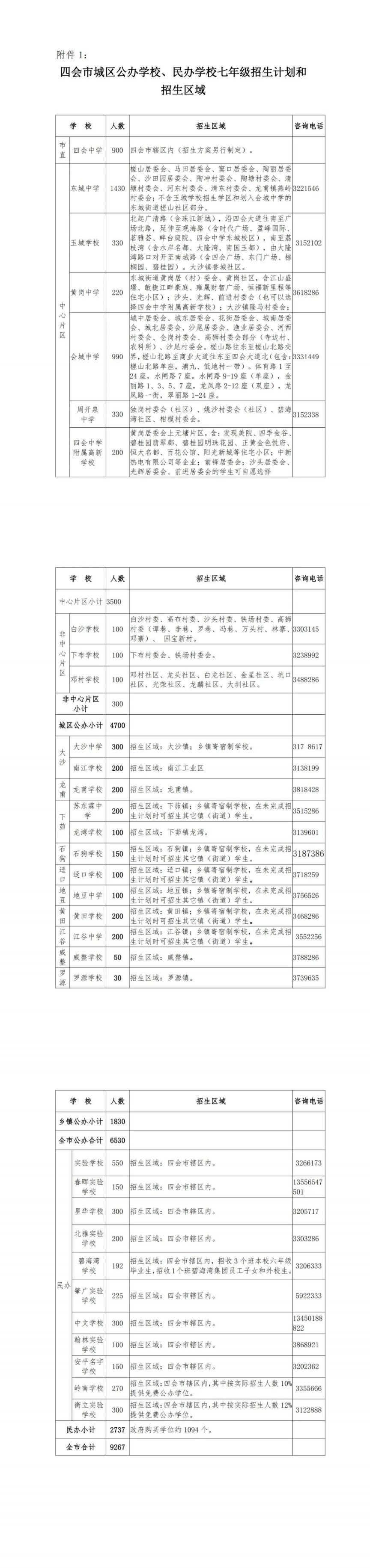 》》》附件1 四会市城区公办学校、民办学校七年级招生计划和招生区域