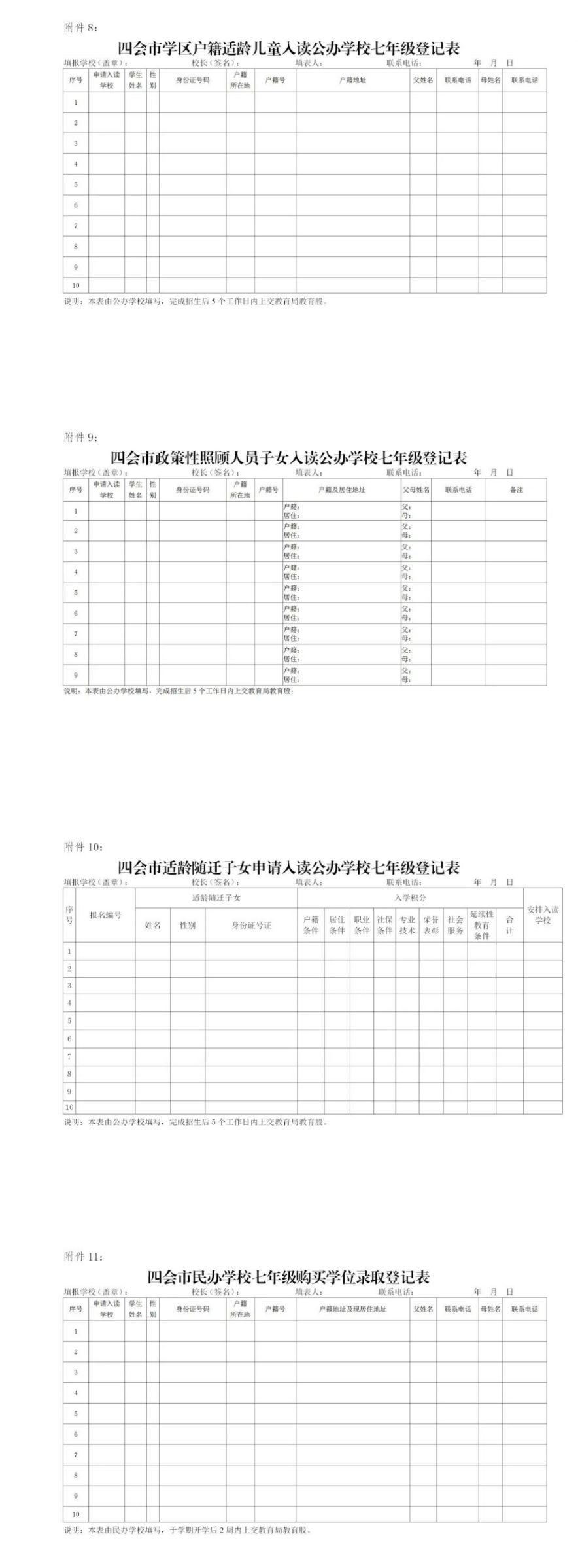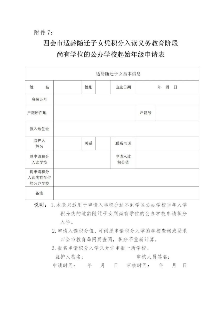 ⑥二次积分入学。市教育局完成中心片区学校学位统筹安排后,公布各学校的剩余学位数和二次积分入学报名时间,未达到中心片区最低控制积分线的适龄儿童可在规定时间内,选择1所仍有剩余学位的公办学校进行二次积分入学申请,填写《四会市适龄随迁子女积分入读义务教育阶段尚有学位的公办学校起始年级申请表》(附件7),学校按照剩余学位数和申请适龄儿童的积分由高至低进行二次积分入学录取。