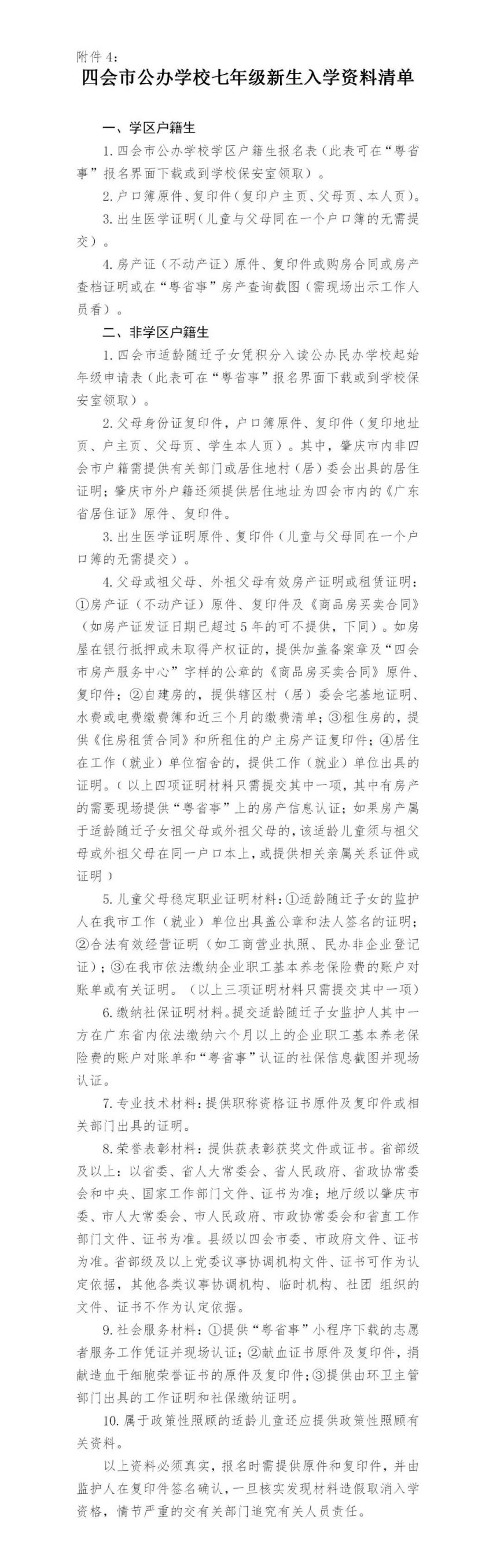 》》》附件4 四会市公办学校七年级新生入学资料清单
