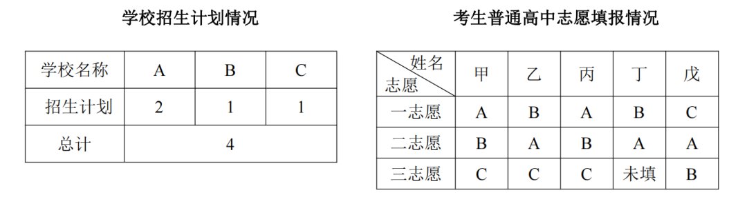 举例说明:共有A、B、C三所学校,招生计划分别为2个、1个、1个。有甲、乙、丙、丁、戊5名考生,成绩排序为甲最高、戊最低依次排序。即如下图所示情况: