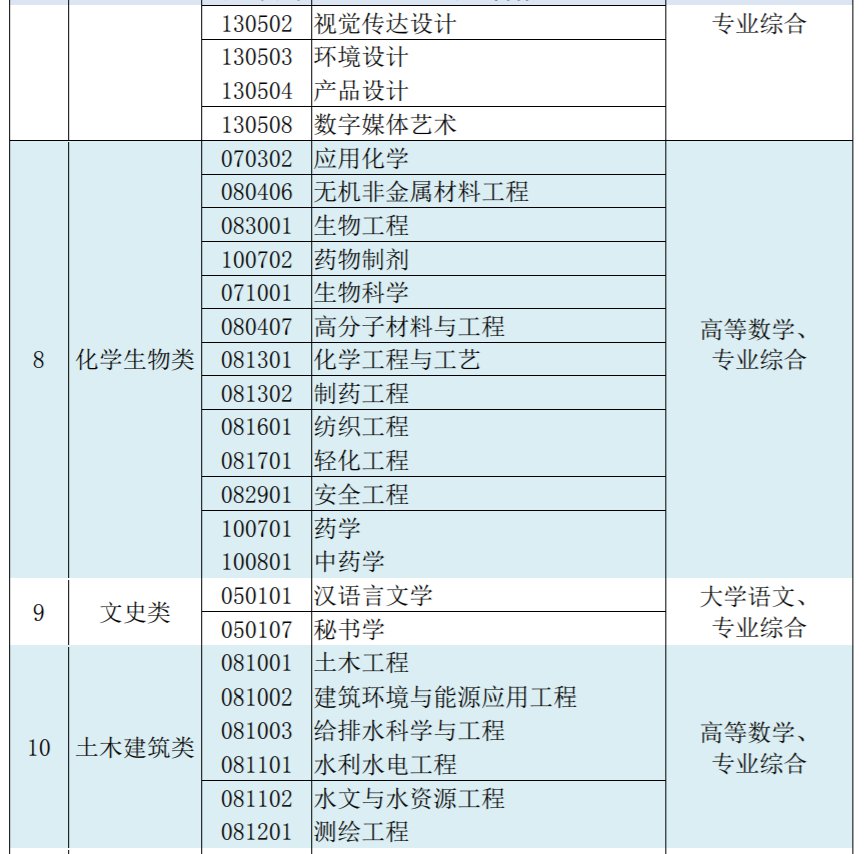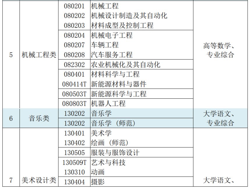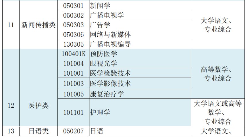 各专业大类考试科目参见以下表格。选考日语语种的非日语专业考生可以按照日语专业考试成绩计分办法执行,但这类考生不得报考高校在招生计划中注明仅招收英语语种的专业。