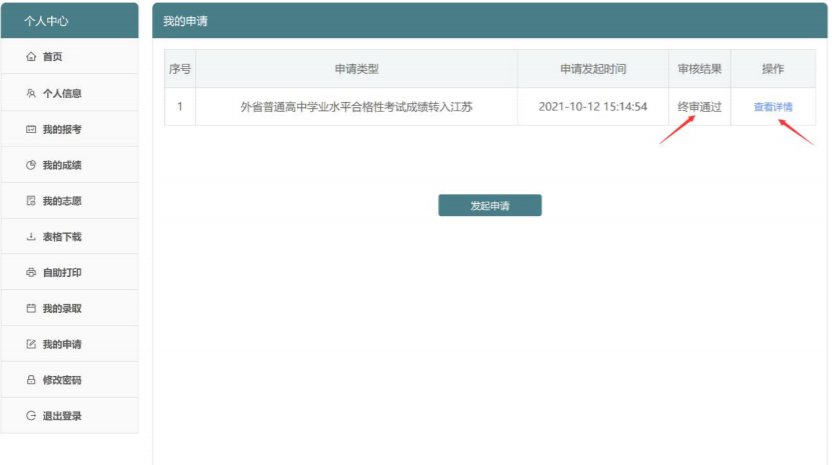 8、提交申请后可再次从“我的申请”进入“外省普通高中学业水平合格性考试成绩转入江苏”申请页面点击“点击进入”查看“审核结果”进度。