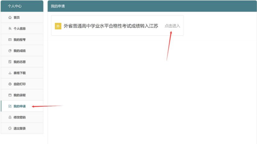 2、在“我的申请”中选择“外省普通高中学业水平合格性考试成绩转入江苏”,并点击“点击进入”。