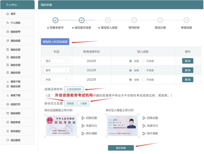 6、点击“增加转入科目和成绩”添加科目和成绩,并且点击“上传证明材料”上传成绩证明材料、点击“国徽面”和“人像面”上传身份证正反面后再点击“提交审核”。