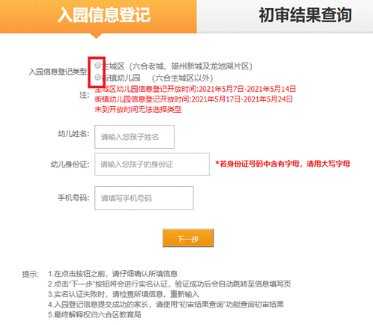3.选择入园信息登记类型,填写幼儿姓名,身份证和手机号,点击下一步。