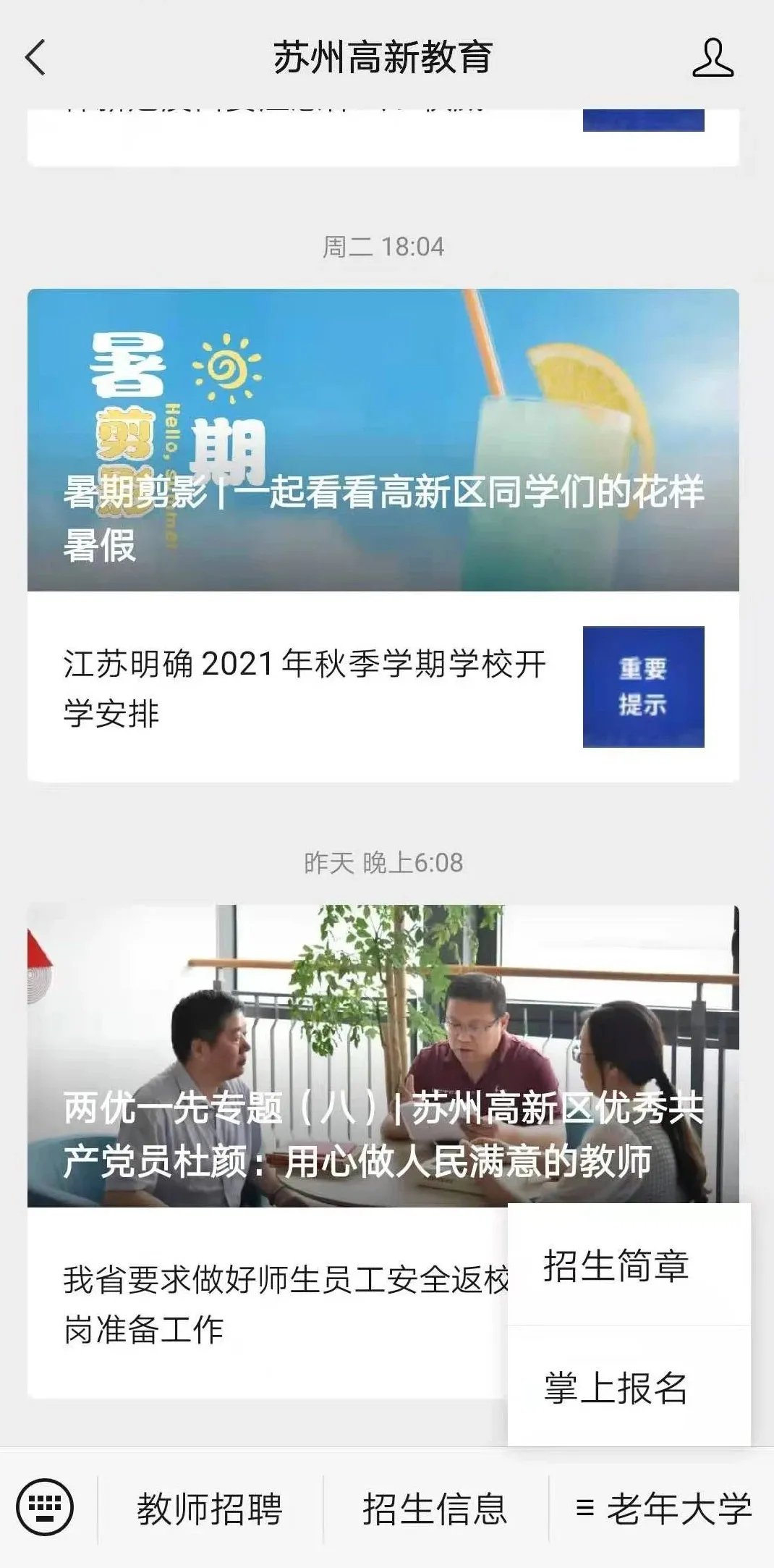 方法三:关注“苏州高新教育”微信公众号,点击“老年大学”——掌上报名。
