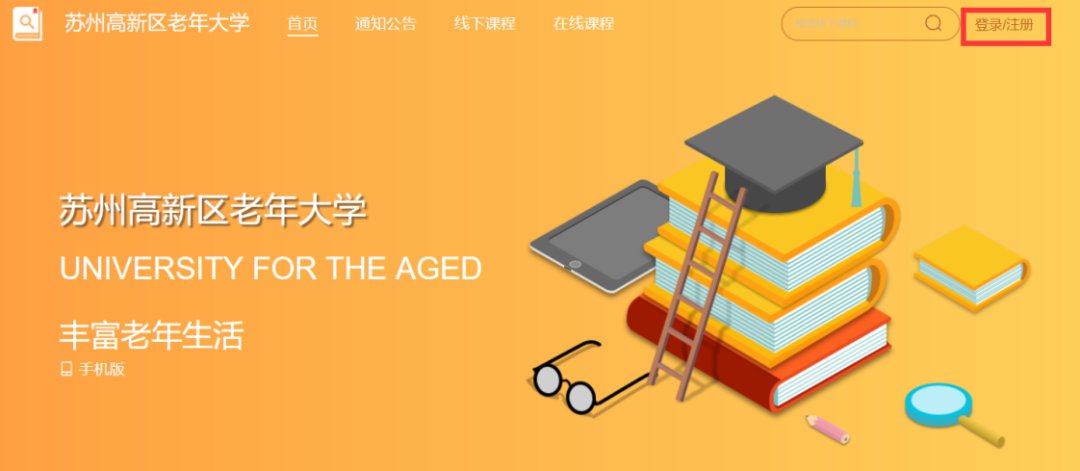 2.登陆“苏州高新区老年大学”报名平台,在右上角点击“登陆/注册”按钮注册学员信息。