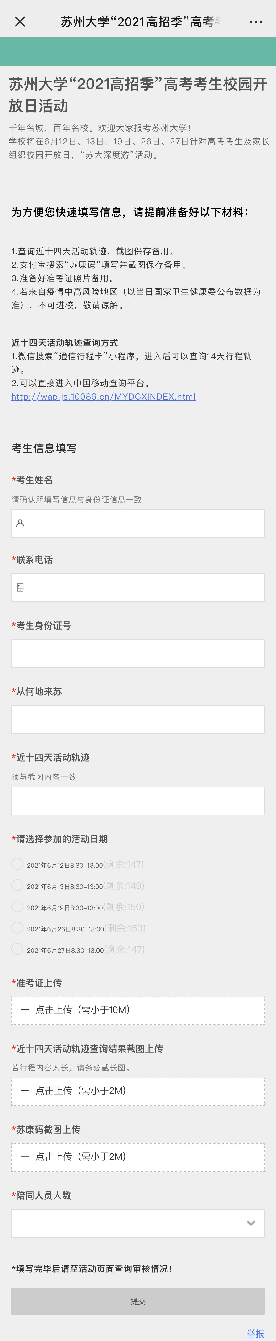 2.鼓励考生独立进校,有特殊情况的,也可1-2名家长陪同。成功预约独立进校的考生,进校后将获赠精美的苏大文创产品一套。