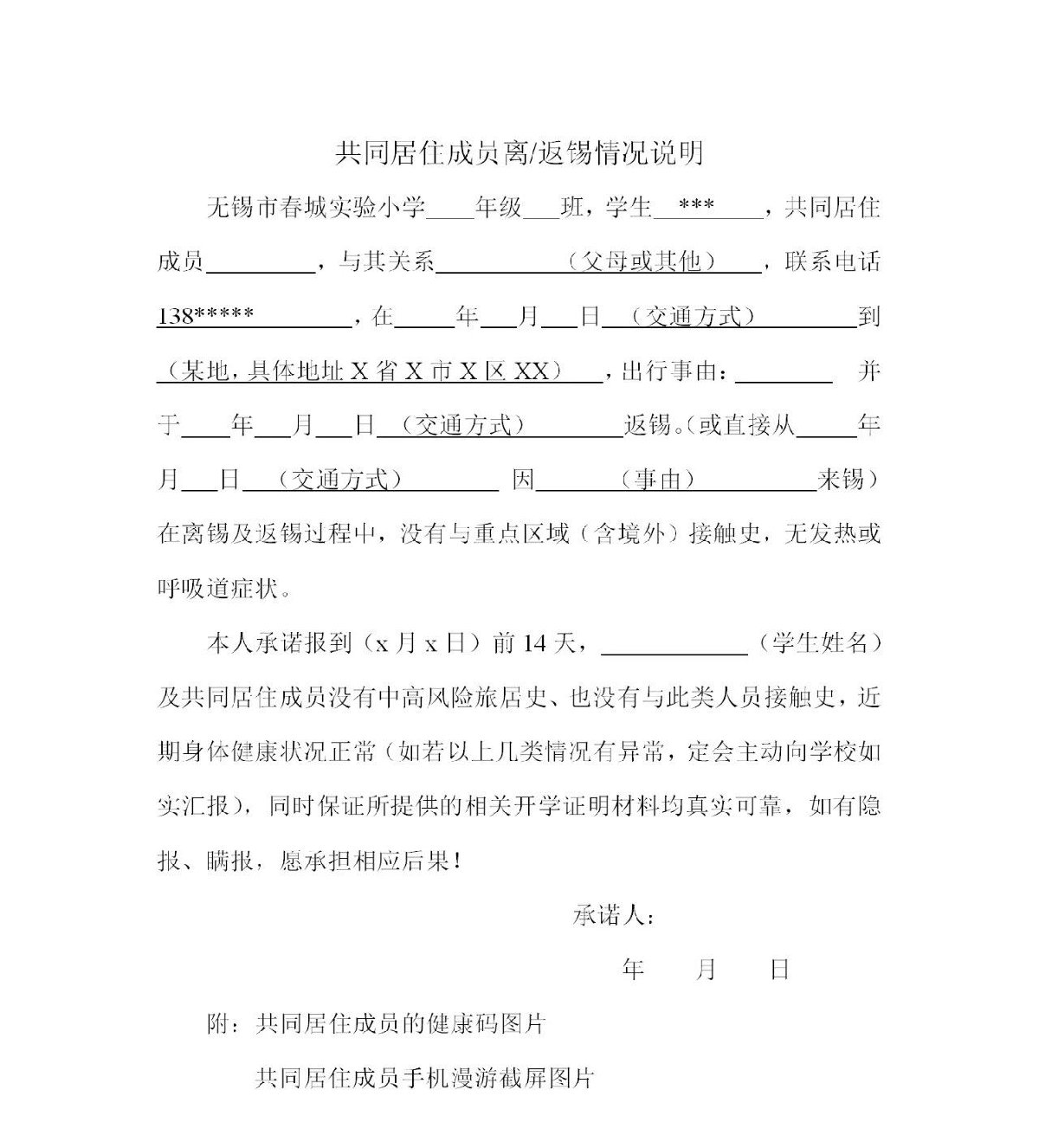 根据最新的疫情防控要求,到开学前学生必须在锡满14天(8月15日起必须在锡),请各位家长让学生按时返锡。 所有学生入学时需提供健康码截图和共同居住成员的健康码、手机漫游记录,在开学时上交给班主任。 如果有家庭存在离锡/返锡情况,还必须根据实际情况填写《共同居住成员离/返锡情况说明》(无离锡/返锡情况不需要填写此说明),承诺人签名必须为手写!承诺人签名必须为手写!承诺人签名必须为手写!开学一并交给班主任。