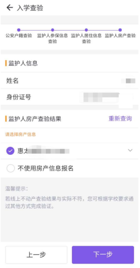 选择对应学区的房产信息,点击“下一步”,如您的房产不在所报名学校学区的范围内,亦可以选择不使用房产信息报名。