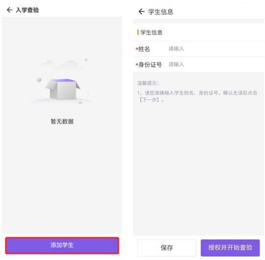 如实填写学生基础信息;输入学生姓名、身份证号后,点击“授权并开始查验”,系统在线查验学生及监护人户籍信息。