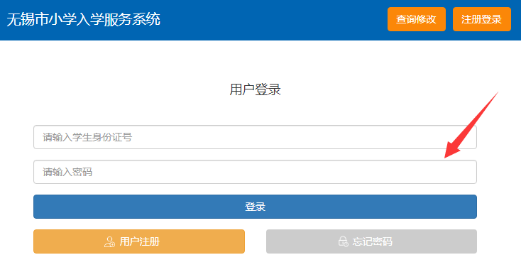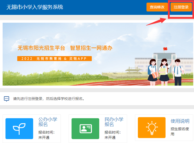 进入“无锡市小学入学服务系统”,页面右上角点击“注册登录”