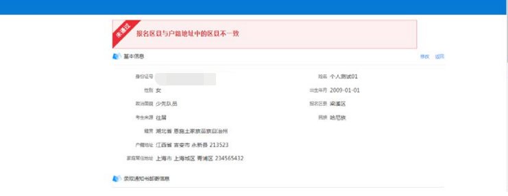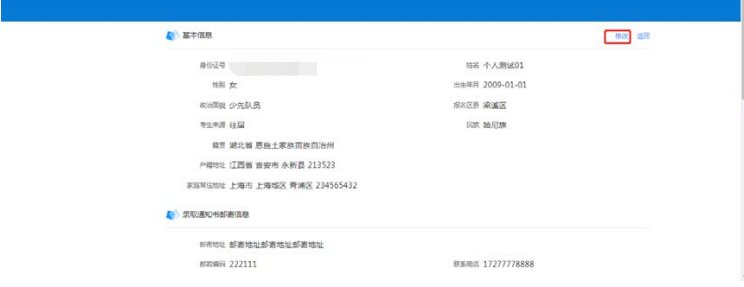 如果报名信息审核不通过,页面会提示网上初审通过及相关提醒。考生可以点击“修改” 按钮进入修改流程,按照审批结果的提示修改考生信息材料并重新提交。如图所示:
