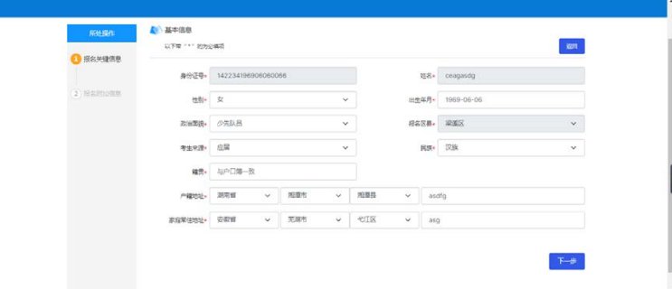 3、报名关键信息填报首先是报名关键信息的填报,填写完成后,点击“下一步”进行报名附加信息的填报。如图所示: