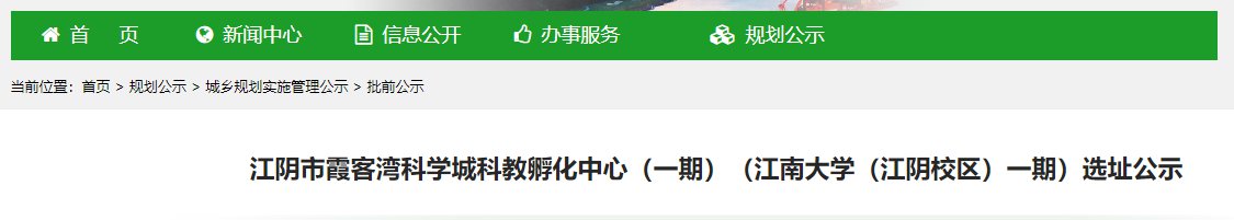 江阴市霞客湾科学城科教孵化中心(一期)(江南大学(江阴校区)一期)选址公示