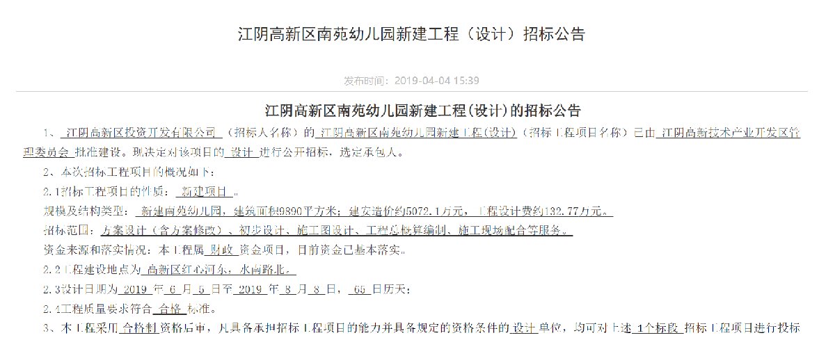 江阴高新区南苑幼儿园新建工程(设计)的招标公告