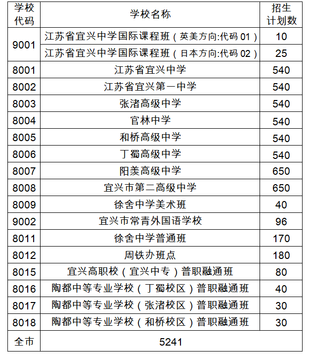 注:江苏省宜兴中学和江苏省宜兴第一中学的计划不包含招录自主招生的各90人。