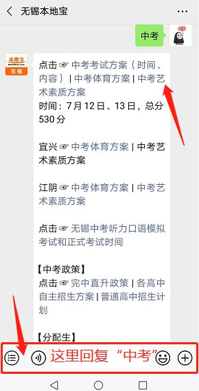温馨提示:微信搜索公众号“无锡本地宝”,在聊天框回复“中考”,查询无锡中考方案、中考时间、历年分数线、查分方式等最新消息;分别回复“分配生”,查询无锡分配生政策,历年分配生名额等;回复【XX学校】(如“天一中学”“省锡中”)即可查询该学校招生要求、分数线、自主招生等。