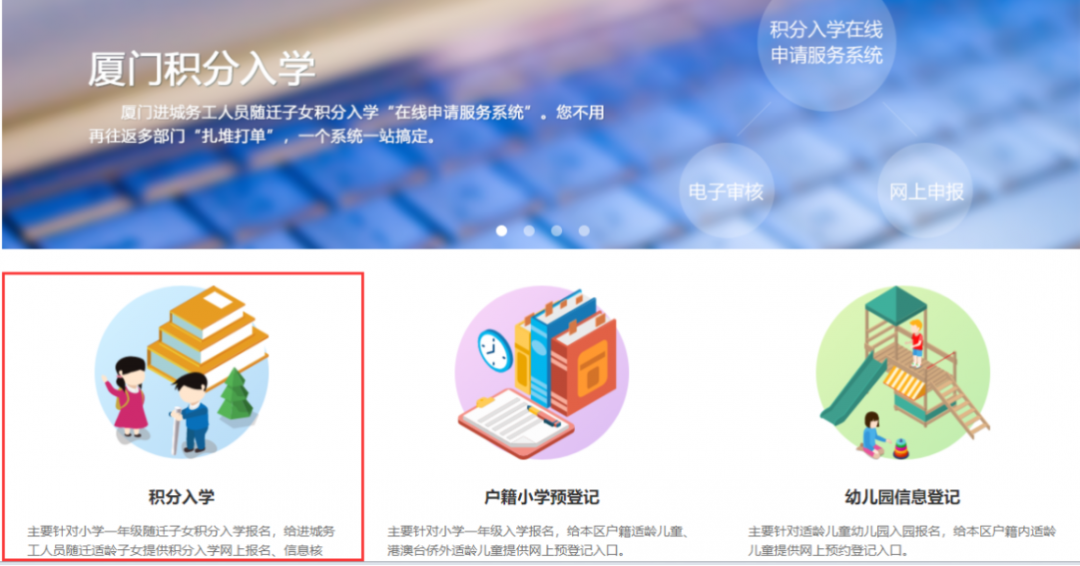 1、点击“积分入学”页面默认为思明区,请请先点选“湖里区”,再点击“湖里区积分入学网上报名”入口。