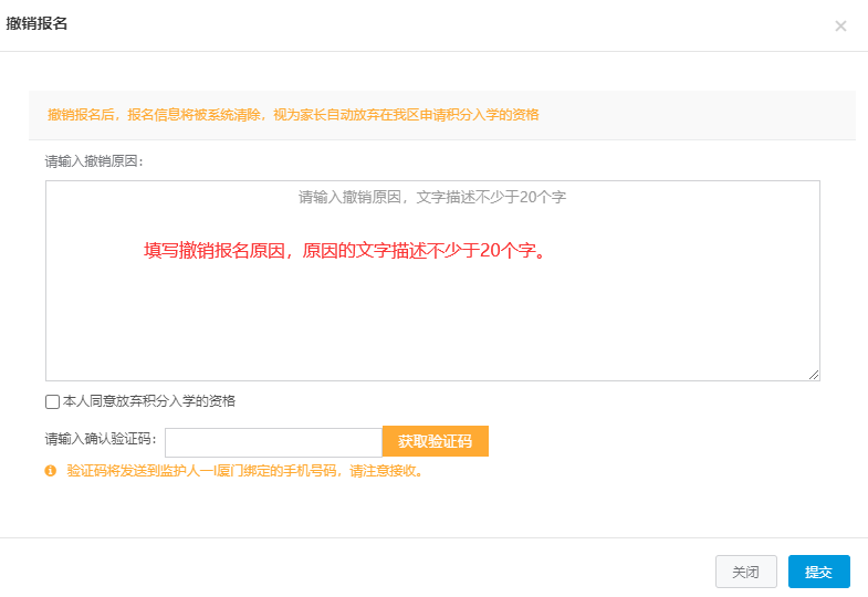 撤销报名需注明撤销原因(原因的文字描述不少于20个字),填写验证码,方可撤销报名。撤销报名后,即为自愿放弃参加我区2022年积分入学。