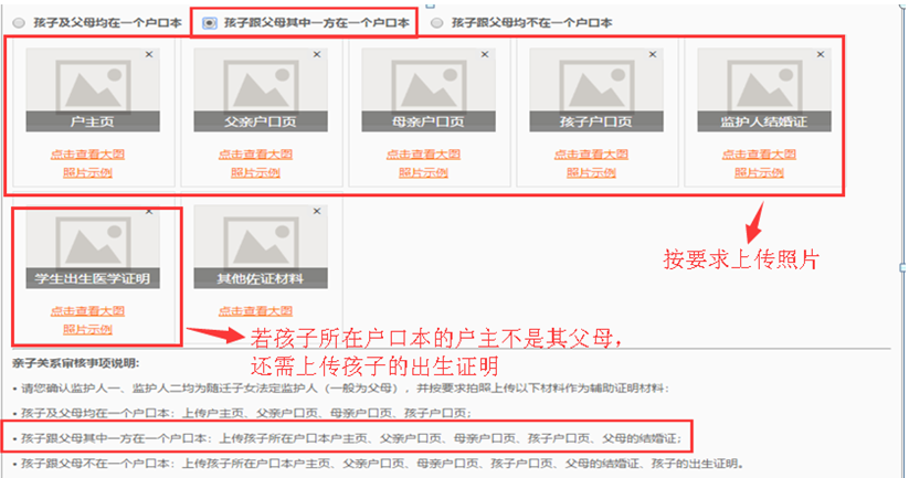 孩子跟父母其中一方在一个户口本,需要上传孩子所在户口本户主页、父亲户口页、母亲户口页、孩子户口页、父母的结婚证。