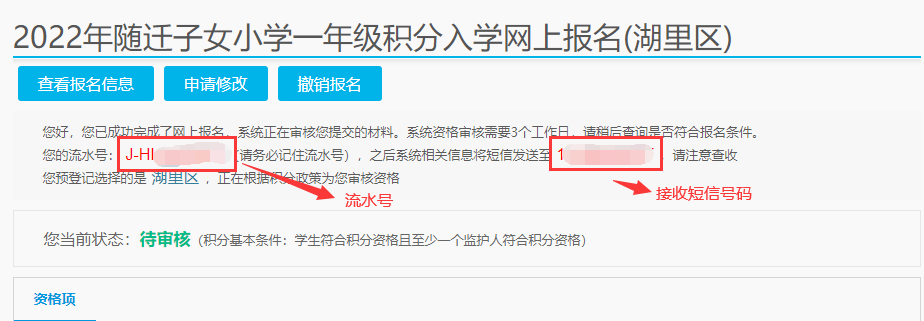 报名信息提交成功后,系统会生成一个唯一的流水号,系统将来到资格审核界面。家长后期可登陆系统查看资格审核状态。