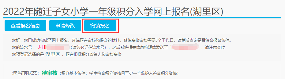 因个人原因,自愿放弃参加积分入学,可点击“撤销报名”。