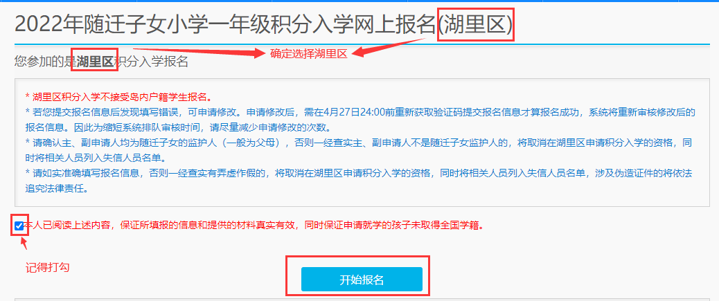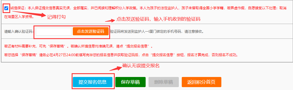 2.报名起止时间为:2022年4月18日至2022年4月27日,请需要报名的学生家长务必在4月27日24:00之前填写信息并获取验证码提交报名信息,否则即视为自愿放弃在湖里区参加积分入学的资格。