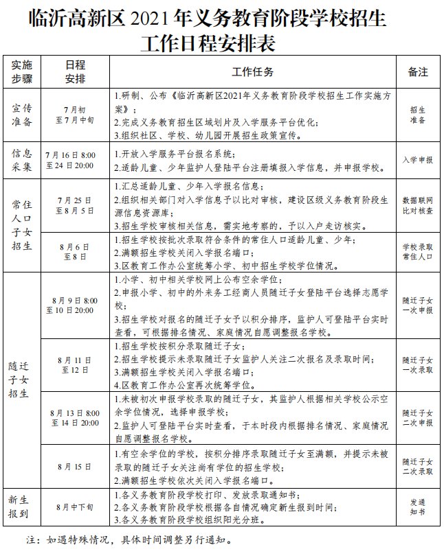 临沂高新区2021年义务教育阶段学校招生工作日程安排表
