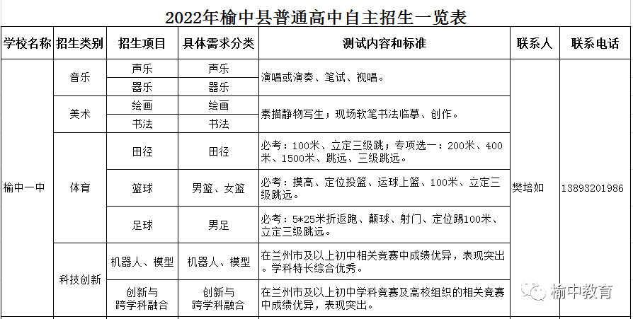 为进一步规范做好2022年普通高中自主招生工作,经市教育局对自主招生学校招生资格的重新核定,现将2022年榆中县普通高中自主招生学校、招生项目、招生类别、测试标准等予以公布,请遵照执行。相关工作具体安排如下: