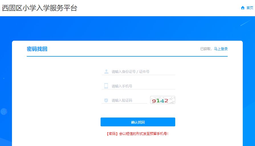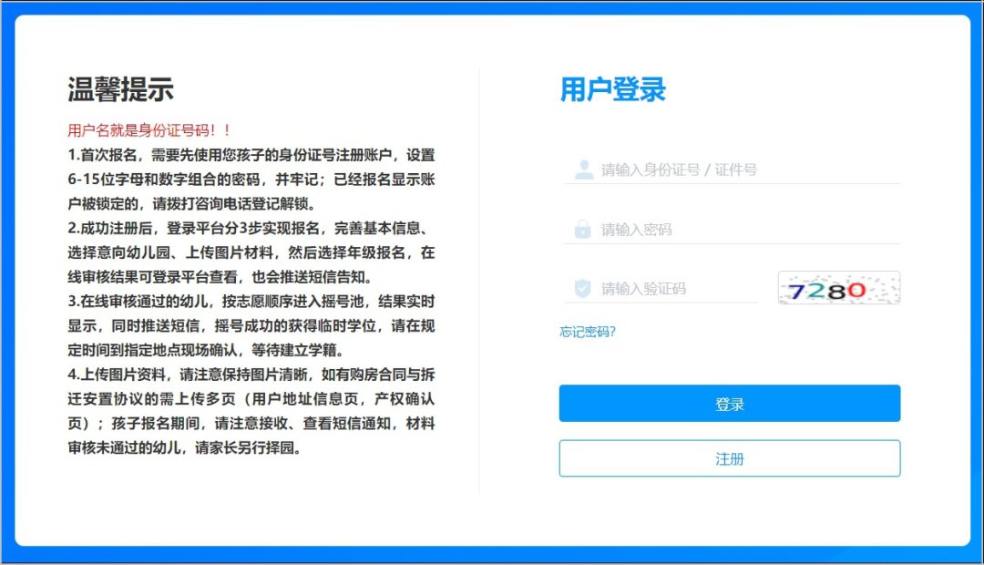 首次进入登陆界面的家长请点击注册后进入,若已完成注册可通过身份证号码和密码进行登陆。如家长忘记密码,在此页面点击“忘记密码”按钮找回,密码会以短信的形式发送给家长。