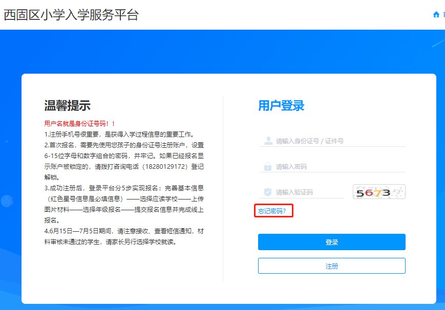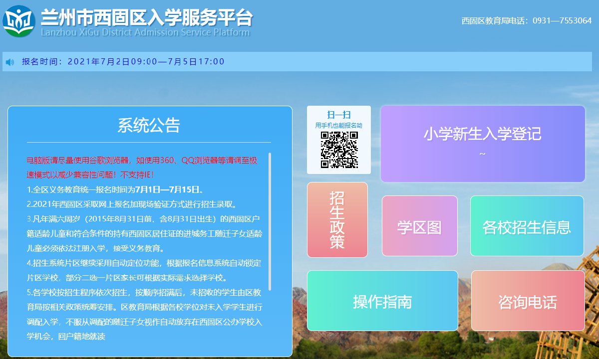 进入系统后,在首页可查询西固区招生政策、学区位置、各校招生信息、操作指南,若有其他问题也可拨打咨询电话,阅读系统公告后,点击小学新生入学登记可进入“报名须知”页面,请注意在规定时间内报名(手机端无法查询上述信息,直接进入“报名须知”页面)