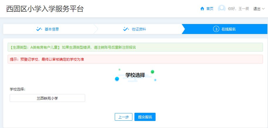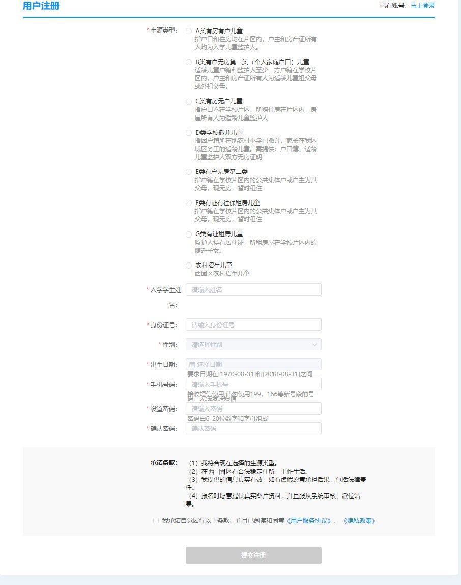 首先家长需先选择入学儿童的入学类型,入学类型请完全按照“报名须知”页蓝色部分的招生顺序进行选择,