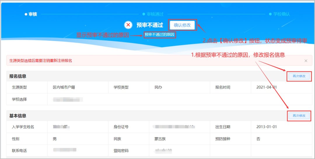 提交报名结果的显示,如下图。请家长认真检查之前所填写的基本信息、报名信息、和资料上传信息,如有错误,可点击“再次修改”及时改正。报名后,待学校审核、摇号、现场确认,家长可随时登录网站查询审核结果、摇号结果等信息,系统也会以短信方式通知报名各阶段信息。家长可点击报名结果页右上角的“打印报名表”打印报名信息。预审不通过的学生可在收到预审不通过提醒后修改报名信息,并再次提交。