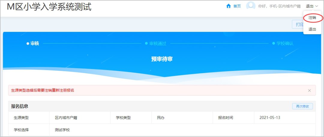 生源类型选错后可以点击右上角“注销”按钮注销学生当前的所有信息重新注册报名。