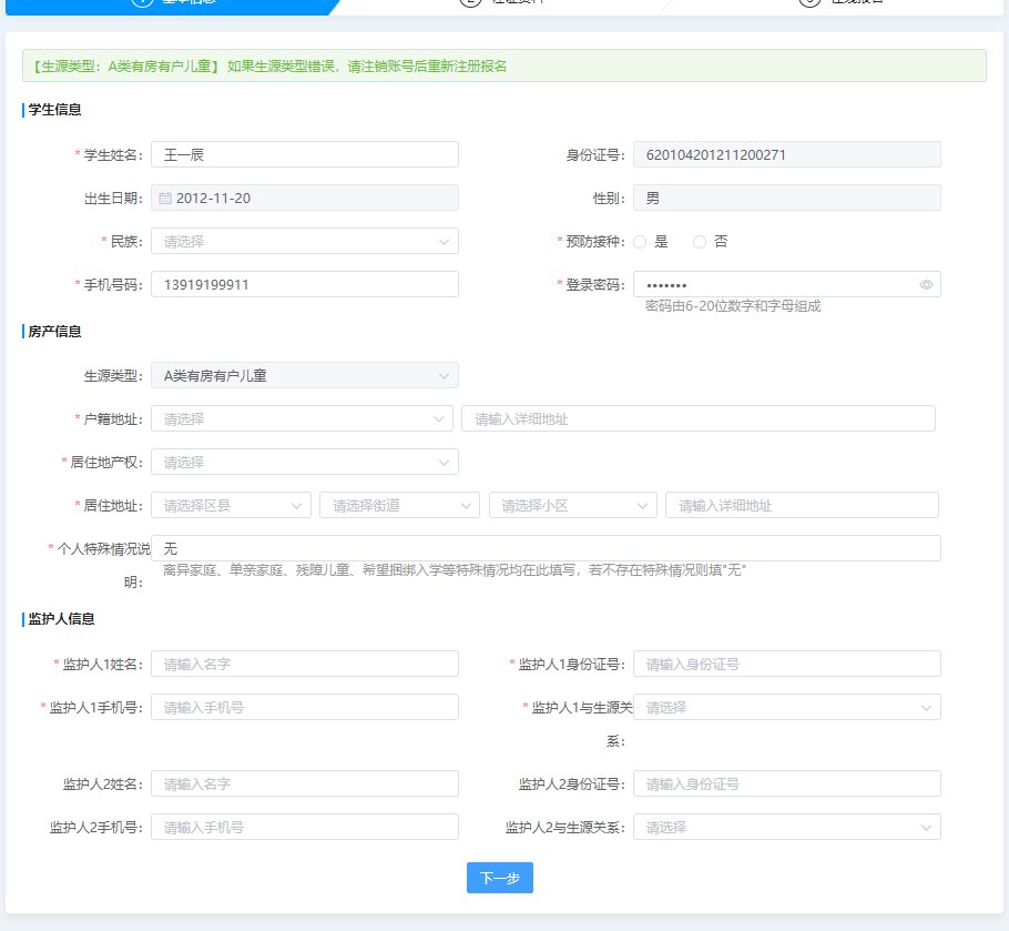报名第一步:选择好入学儿童的类别后,系统会根据所选类别显示不同的报名信息,所有报名信息都是必填项,报名信息会影响第三步资料上传的需求(如“预防接种”选择了“是”,资料上传必须上传预防接种证),请根据自身实际情况填写,填写监护人的相关信息,至少填写一个监护人,填写完成点击“下一步”即可;