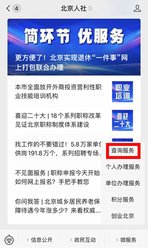 第二步:进入“北京人社”微信公众号菜单栏,点击“微服务”栏目中的“查询服务”子栏目。